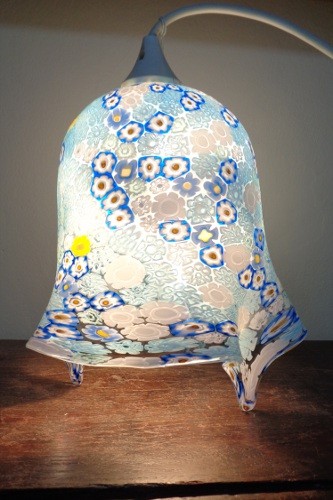Suspension en verre de Murano composée de murrines millefiori, tons bleus, hauteur 19 cm, diamètre base plus large 19 cm. Livrée avec système électrique.